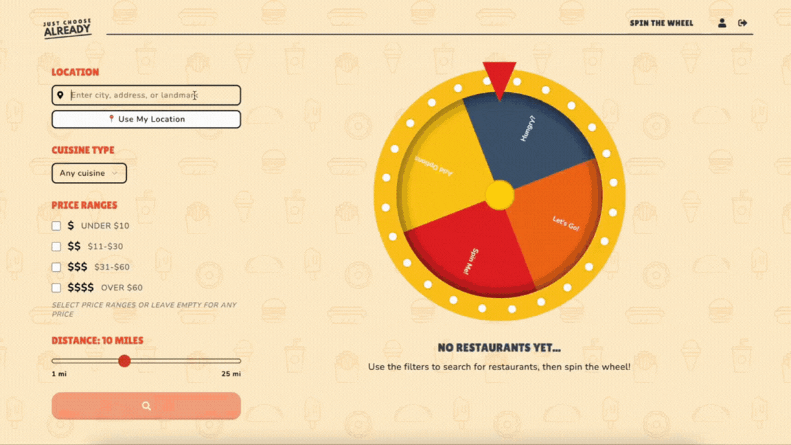A restaurant decision-making web application that spins a wheel to help indecisive groups finally pick a place to eat.